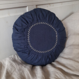 Je šitý z modrého 100% ľanu, doplnený strojovou výšivkou. Obliečka sa vzadu  sťahuje šnúrkou, vnútro ja okrúhly vankúš zo 100% bavlny, vyplnený dutým vláknom ( cca 400g) vlastnej výroby.